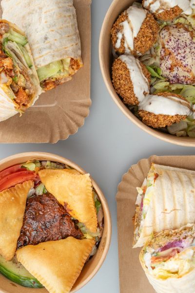 mit 2 Stück Falafel dazu ein Wrap und Gemüse.